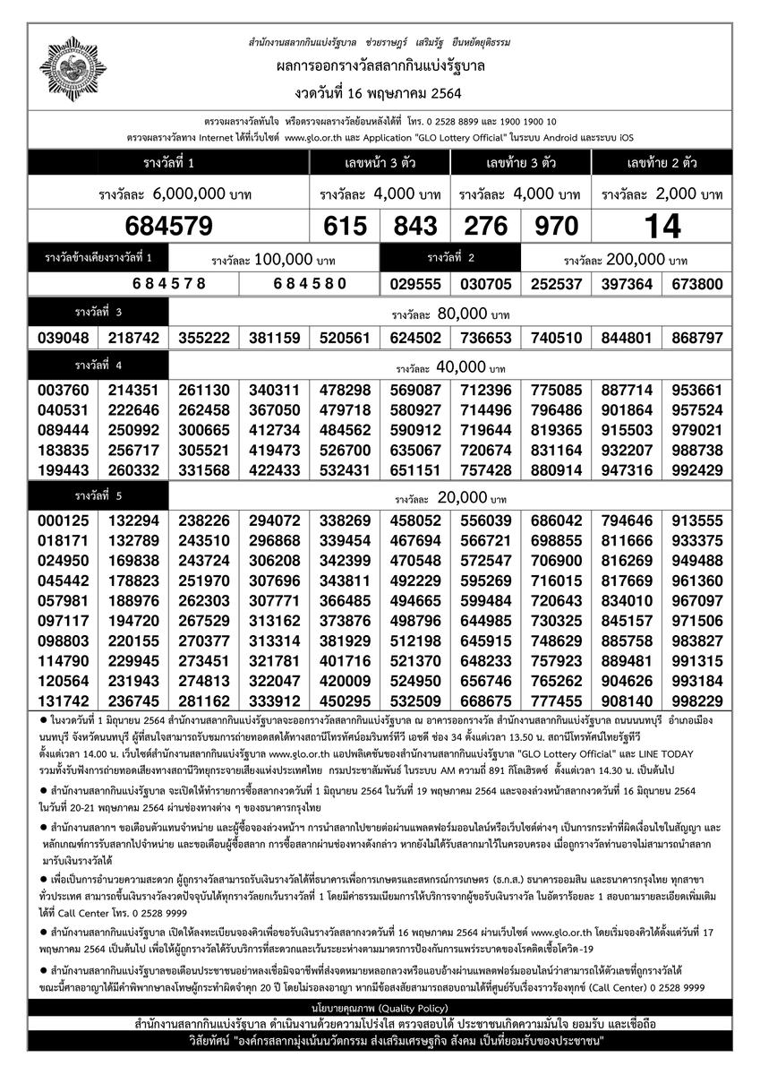 ผลสลากก นแบ งร ฐบาล งวดว นท 16 พฤษภาคม 2564 อ นโฟเควสท